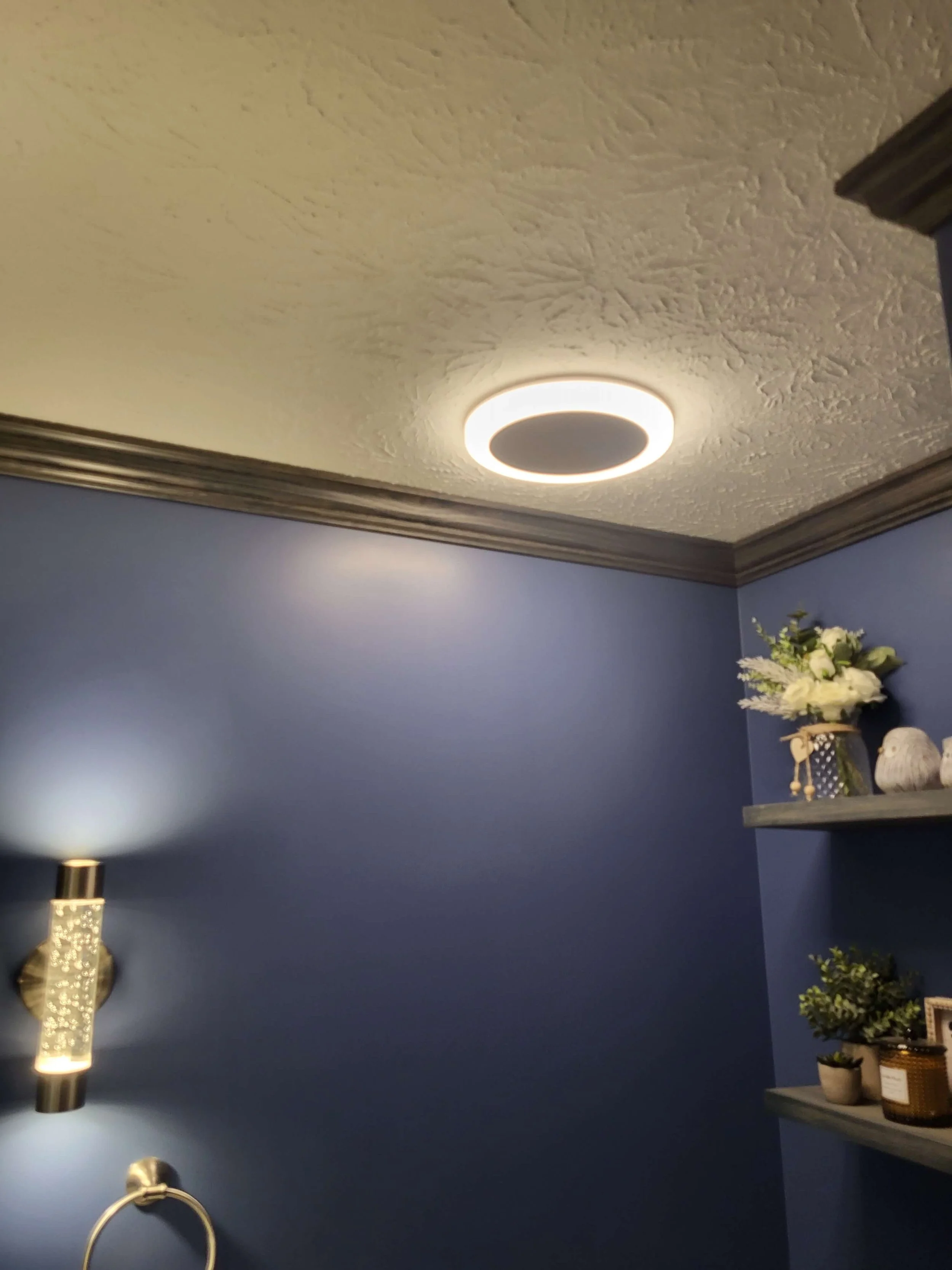 The project also included a ventilation upgrade with integrated lighting, crown molding, and a textured ceiling finish (stomp), completing the transformation from top to bottom.